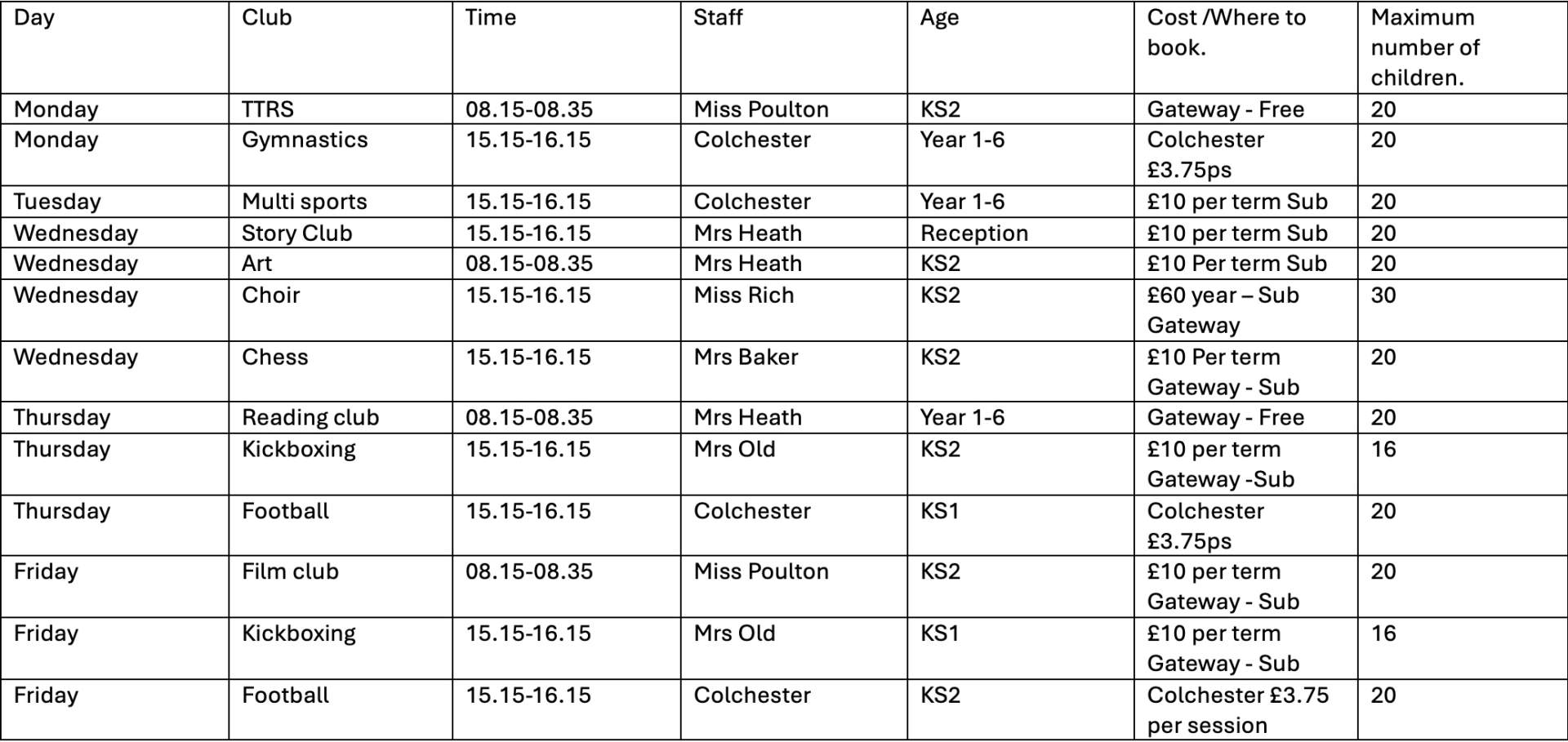 Clubs run from the first day back at school each term and end on the last day, unless previously advised.
